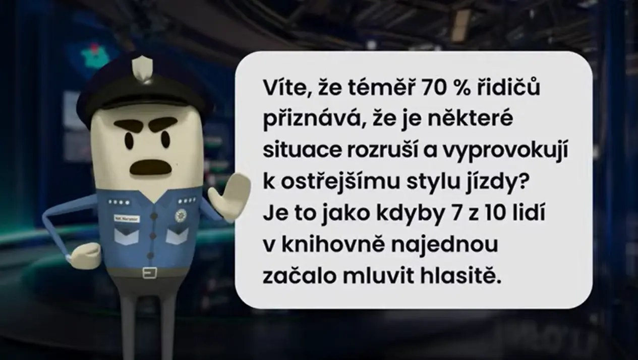 Roman Budský, dopravní expert, Platforma Vize 0: „Ale mně se líbí ta nizozemská, která říká stručná, jasná, že agresivní chování je úmyslné jednání, jehož cílem je emocionálně nebo fyzicky poškodit jiného účastníka silničního provozu. Faktem je, že drtivá většina lidí, co jsou na silnicích, jsou slušní, opravdu se chovají slušně. A ti agresoři jednak ohrožují a jednak řekněme vytvářejí blbou náladu.“policista Horymír: „Víte, že téměř 70 procent řidičů přiznává, že je některé situace rozruší a vyprovokují k ostřejším stylu jízdy? Je to, jako kdyby sedm z deseti lidí v knihovně najednou začalo mluvit hlasitě.“Roman Budský, dopravní expert, Platforma Vize 0: „Ona agresivita je primární, to znamená někdo prostě na vás hodí kotvu, myšku, někdo vás vytlačí, vjede tam z vedlejší, vykašle se na vás, jestli s tím, co chceš. Já vážím 40 tun, tak se starej. Ale pak je sekundární agresivita. Když už vás ten agresor napadne nebo nějakým způsobem se vám snaží ublížit, tak mu to nevracejte.