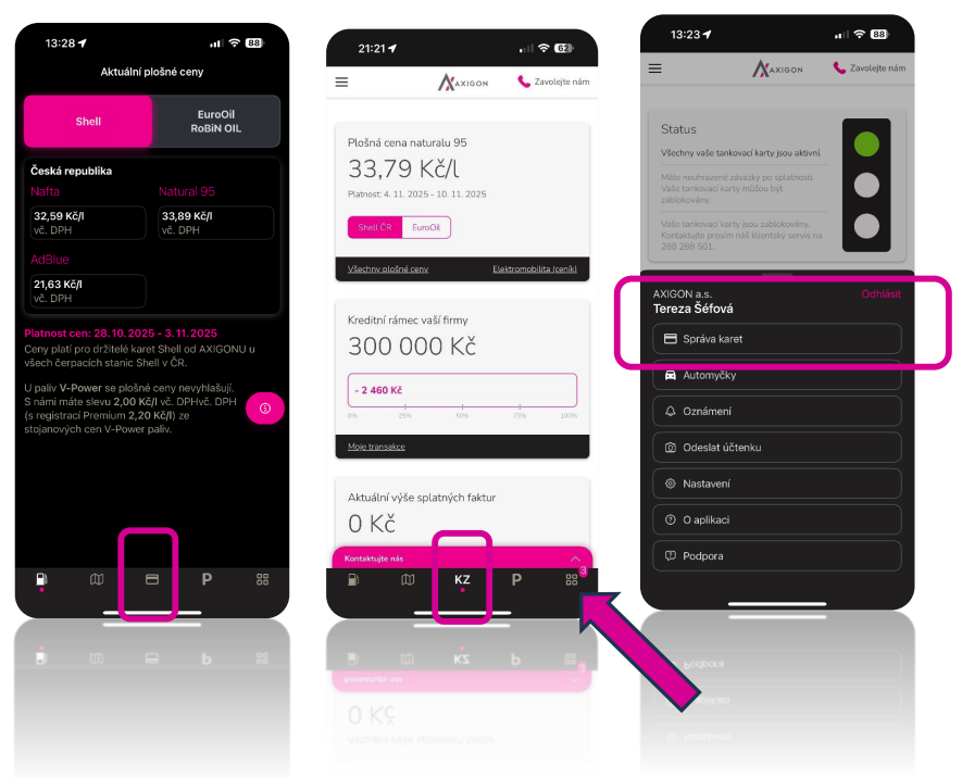 Dosavadní verze aplikace pro držitele tankovacích karet poskytovaných společností Axigon dává uživateli přehled aktuálních plošných cen pohonných hmot vyhlašovaných pro dané období na čerpacích stanicích Shell, EuroOil a RoBiN OIL. Umožňuje samozřejmě jednoduchou správu tankovacích karet i další nastavení v rámci klientské zóny pro firmy a živnostníky. Nechybí ani mapa čerpacích stanic a další služby.