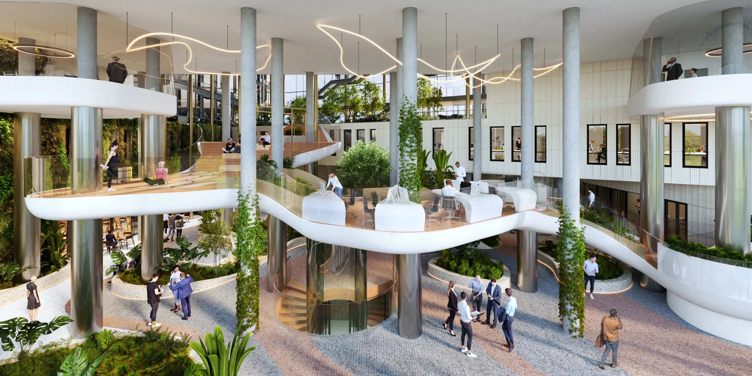 - Aktivaci atria a společných prostor: Atrium se promění v živé srdce budovy s plovoucími platformami, lounge zónami, zavěšenými zasedacími místnostmi s výhledem na řeku a velkou zimní zahradou.