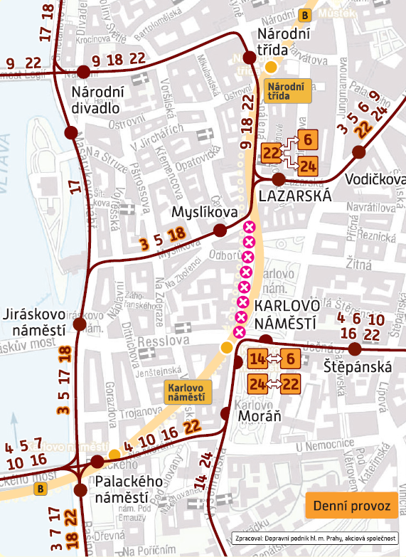 Z důvodu opravy tramvajové trati je od pondělí 24. října 2022 (cca 0:00 hod.) do pátku 4. listopadu 2022 (cca 24:00 hod.) obousměrně přerušen provoz tramvají v úseku Karlovo náměstí – Myslíkova.