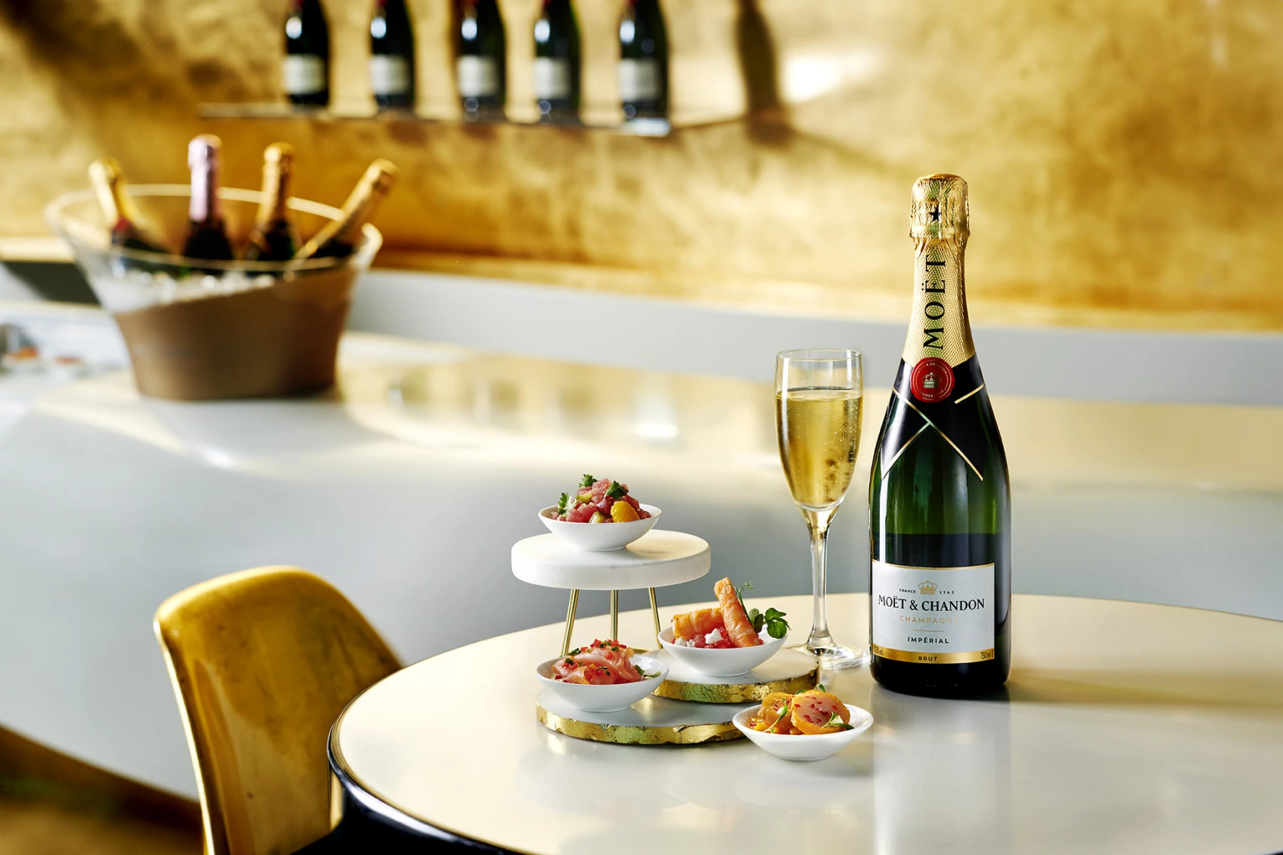 Elegantní salónek Moët & Chandon se pyšní poutavým designem se zlatou vlnou, která je zdobená 2 400 zlatými, ručně nanášenými lístky. Hosté si mohou vychutnat čtyři špičková šampaňská Moët & Chandon. Nejnovější kolekce, která byla uvedena minulý měsíc, nabídne Moët & Chandon Impérial, Rosé Impérial, Nectar Impérial a Grand Vintage 2013.