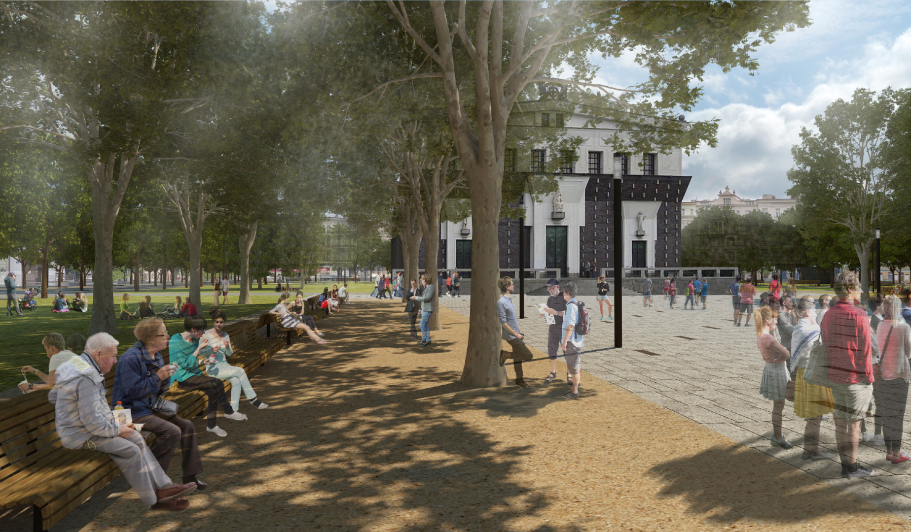 „Dlážděnou plochu před kostelem budou lemovat podélné aleje platanů. Součástí návrhu je také zlepšení způsobu zavlažování a zkvalitnění zelených ploch včetně vybudování retenční nádrže. Vše pak bude respektovat městské standardy jak pro hospodaření s dešťovou vodou, tak pro stromořadí. Obnova řeší celé náměstí komplexně včetně technické infrastruktury i mobiliáře,“ dodává Ondřej Boháč, ředitel Institutu plánování a rozvoje hl. m. Prahy (IPR).