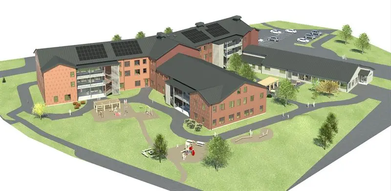 Nová budova bude zahrnovat rezidenční pečovatelské zařízení se 40 pokoji, mateřskou školku pro 90 dětí, komerční kuchyni, školní jídelnu se 150 místy a kanceláře pro domácí pečovatelské služby v Bjurholmu.