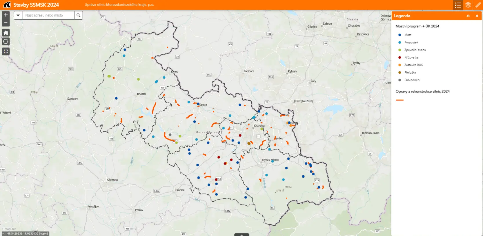 Nová mapová aplikace informuje o rekonstrukcích a stavbách na krajských silnicích v Moravskoslezském kraji, tedy na silnicích II. a III. třídy. Mapa staveb přehledně prezentuje opravy a rekonstrukce silnic, ale i mostů, propustků i opěrných zdí. Aplikaci, která je všem zájemcům bezplatně přístupná, vytvořila Správa silnic Moravskoslezského kraje.