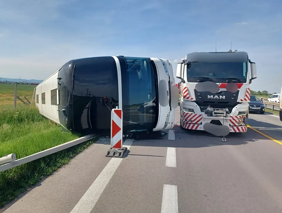 Poblíž Trnavy ve směru na Nitru na Slovensku došlo k nehodě autobusu, který skončil na boku. Vozidlo odtahové služby mělo táhnout autobus po dálnici R1. Při vjíždění na R1 z připojovacího pruhu z D1 měl řidič ztratit nad nákladem kontrolu a ten se, z dosud nezjištěných příčin, převrátil na bok. Při nehodě nedošlo ke zranění. Policisté podrobili řidiče odtahové služby dechové zkoušce, s negativním výsledkem.
