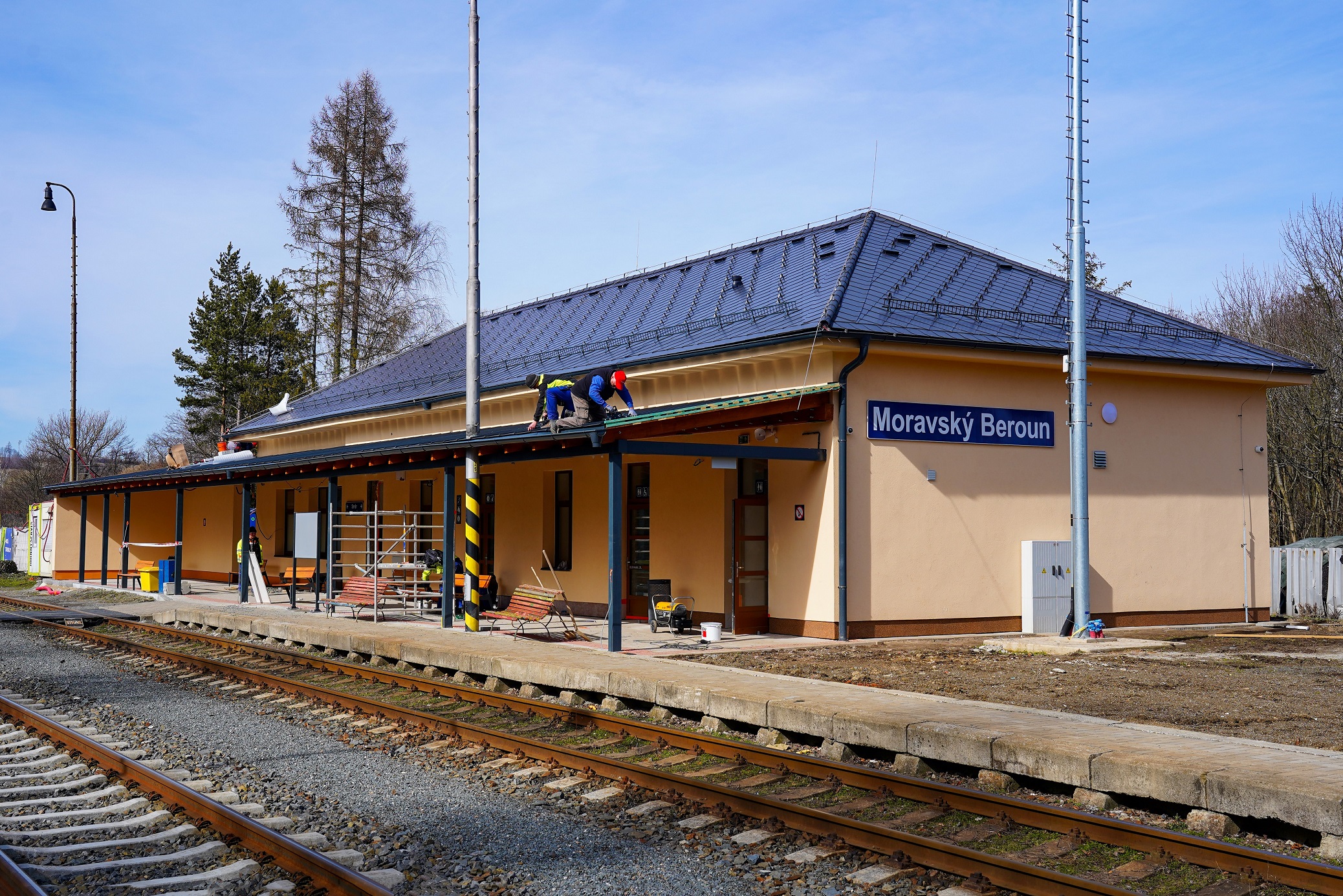 Ve stanici Moravský Beroun (Olomoucký kraj) dokončují dělníci poslední práce na nádražní budově. Celková rekonstrukce za 43,4 milionu korun, kterou provádí společnost Hroší stavby Morava, zahrnovala odstranění části objektu a komplexní obnovu všech prostor.