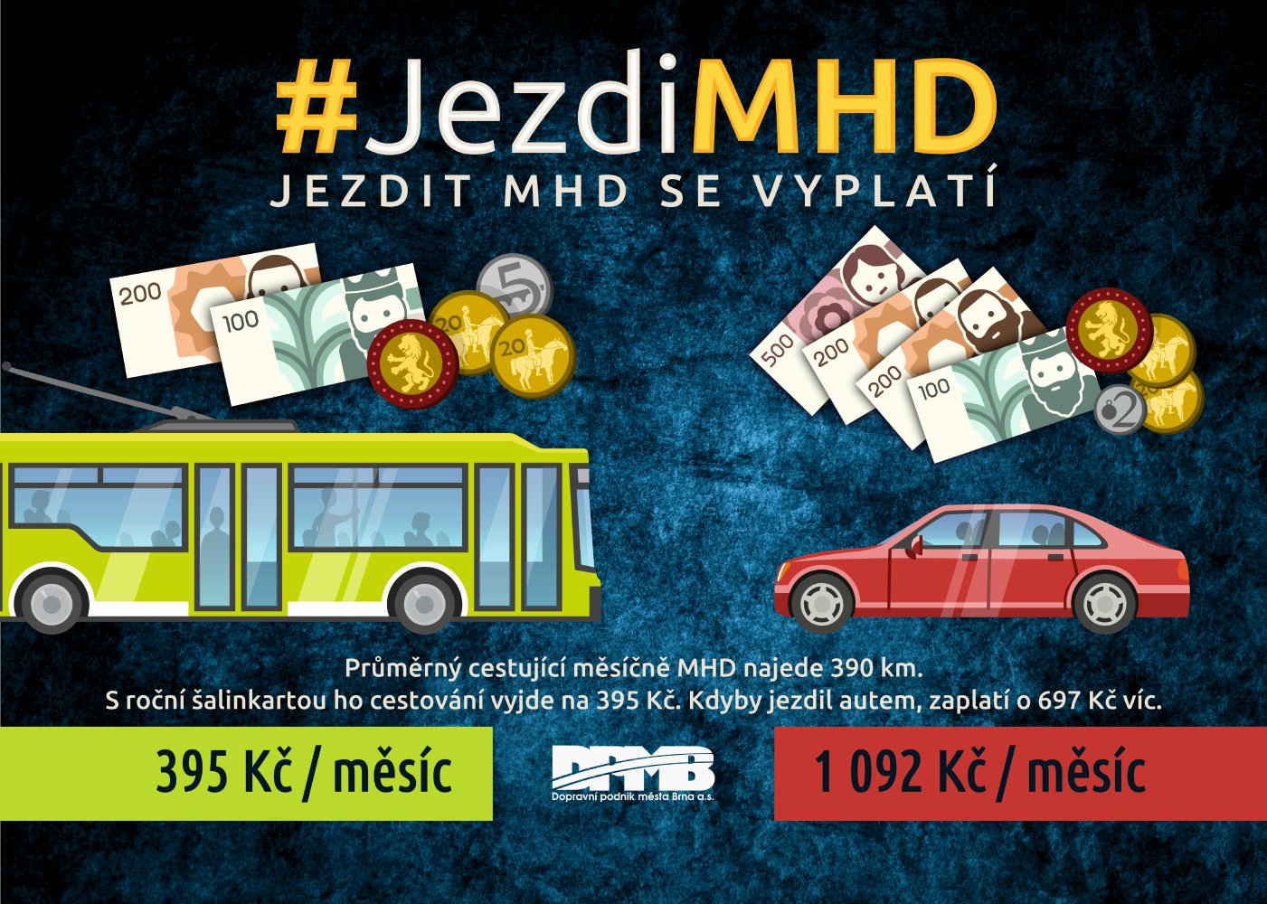 DPMB v kampani porovnává náklady na osobní a hromadnou dopravu. Vychází z čísel, podle kterých držitel předplatní jízdenky v průměru cestuje 13 km denně. Měsíčně tak vozy MHD projezdí 390 km. Při ceně 4750 Kč za roční jízdenku vychází 1 km na 1 Kč. „U cestování osobním vozem jsme vycházeli pouze z průměrné spotřeby a ceny paliva. Do přepočtu jsme vůbec nezahrnuli amortizaci auta, či pravidelné a nutné poplatky za jeho provoz. I tak je cestování MHD téměř trojnásobně levnější,“ popsal Havránek.
