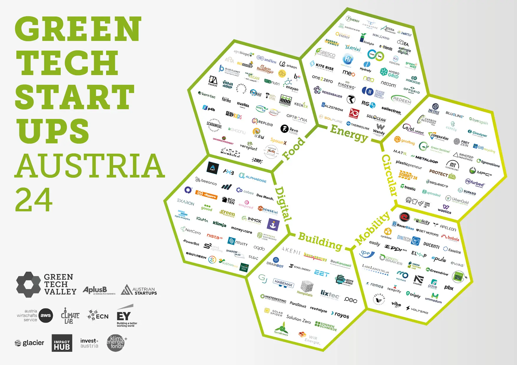 Výňatek ze start-upů ukazuje, jak inovativní jsou přístupy k zelené budoucnosti: Revitalyze (Tyrolsko), EnerCube ( Salcburk ), 2. cyklus FexCo (Dolní Rakousko), Redeem & NetCero (Štýrsko), money:care ( Vídeň ), BergWindEnergy (Horní Rakousko) a Solution Zero (Korutany)
