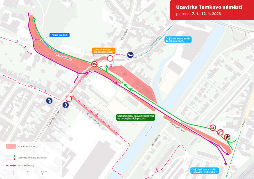 - Ve směru do Husovického tunelu bude platit zákaz odbočení vlevo do Dukelské třídy.