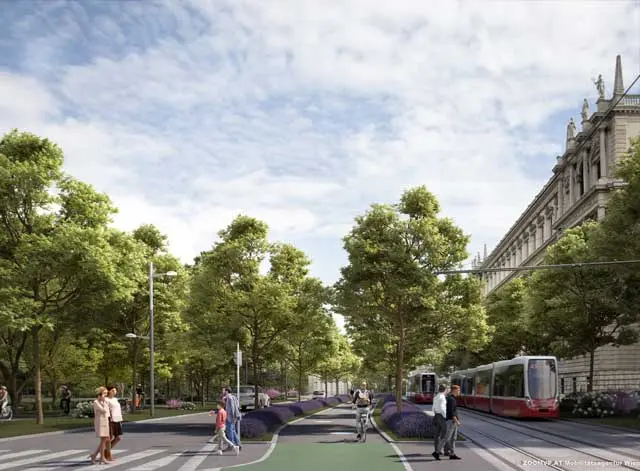 Universitätsstrasse a Alser Strasse jsou v síti hlavních městských cyklostezek a jsou hojně využívány. Dosud tu byly pouze víceúčelové pruhy nebo úzká, jednosměrná cyklostezka. Redesign nyní vytváří prostor pro pohodlné, stavebně oddělené cyklostezky.