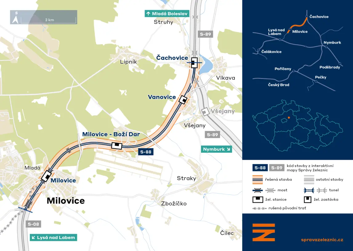 Správa železnic vybrala projektanta takzvané Všejanské spojky, která propojí Milovice s tratí z Nymburka do Mladé Boleslavi. Zhotovitelem projektové dokumentace bude společnost AFRY CZ, která podala nabídku v ceně 117 939 500 korun. K propojení se stávající železnicí dojde v Čachovicích, na devět kilometrů dlouhé trati vzniknou stanice Milovice a Milovice-Boží Dar a zastávka Vanovice. Celkové náklady stavby se odhadují na 9,5 miliardy korun, její realizace začne pravděpodobně v roce 2030.