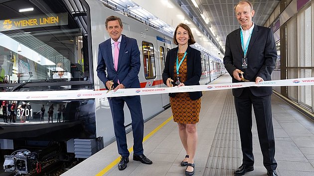 Foto : Radní města Peter Hanke, technický ředitel Wiener Linien Gudrun Senk a vedoucí oddělení kolejových vozidel Siemens Mobility Albrecht Neumann; Foto: Alexandra Gritsevskaya